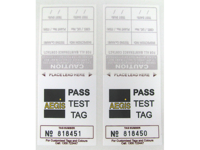 Heavy Duty Test Tags that comply with the requirements of AS/NZS3760:2010. Aegis Test Tags have a sign and seal security lamination flap which prevents tampering of the user's information and protects the tag in harsh environments. All colours available for all your test and tag and PAT testing requirements.Medium duty, heavy duty, thermal, wrap arounds - there's so many types on offer. We specialise in one type of tag that suits all. You only need to carry one set of tags.